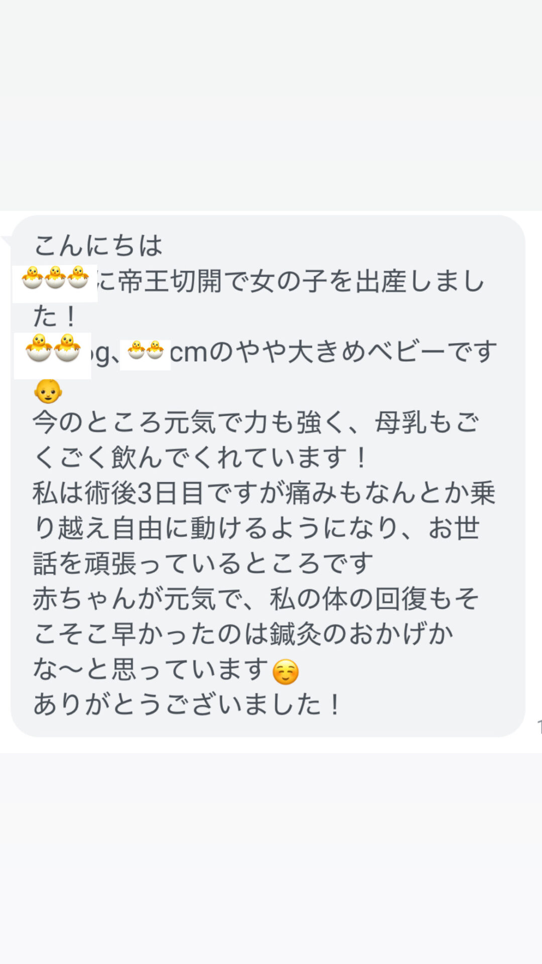 今回結果的に帝王切開となってしまったのですが、施術を続けた事でお腹のかたさも減り胎動が増えるようになっていました。