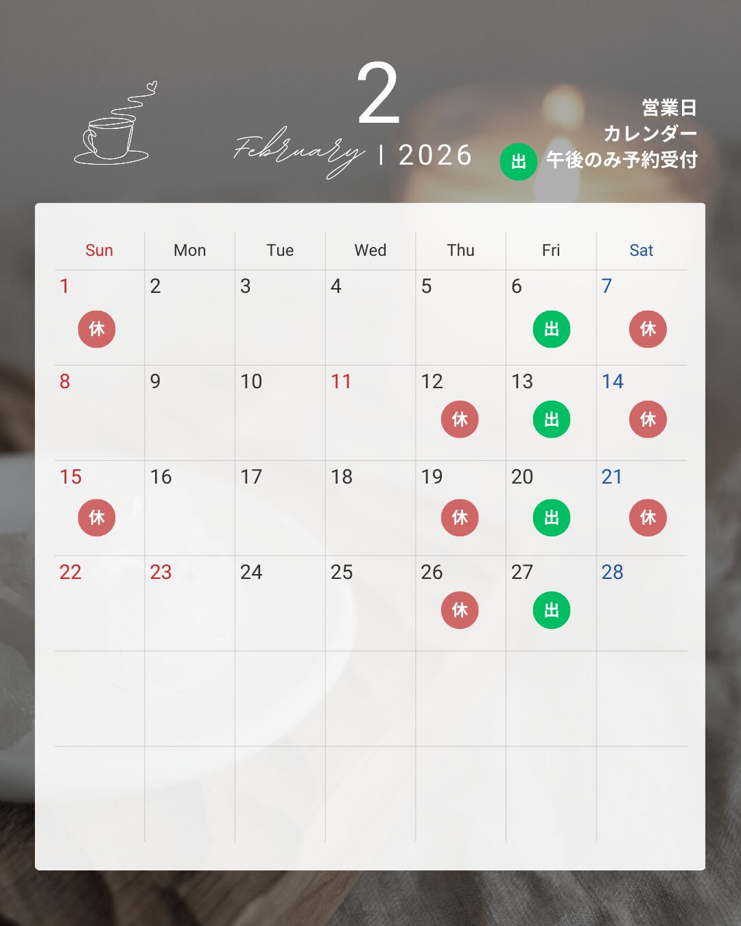 2月も土日お休みのところが入る為お休みが不規則になります。